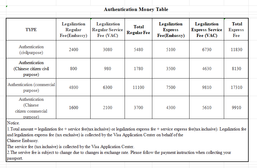 (1) The consular legalization fee will be charged by the Visa Application Center on behalf of the Chinese Embassy on the date of application in Bangladesh Taka. The actual amount to be paid is subject to the Chinese Embassy 's approval.