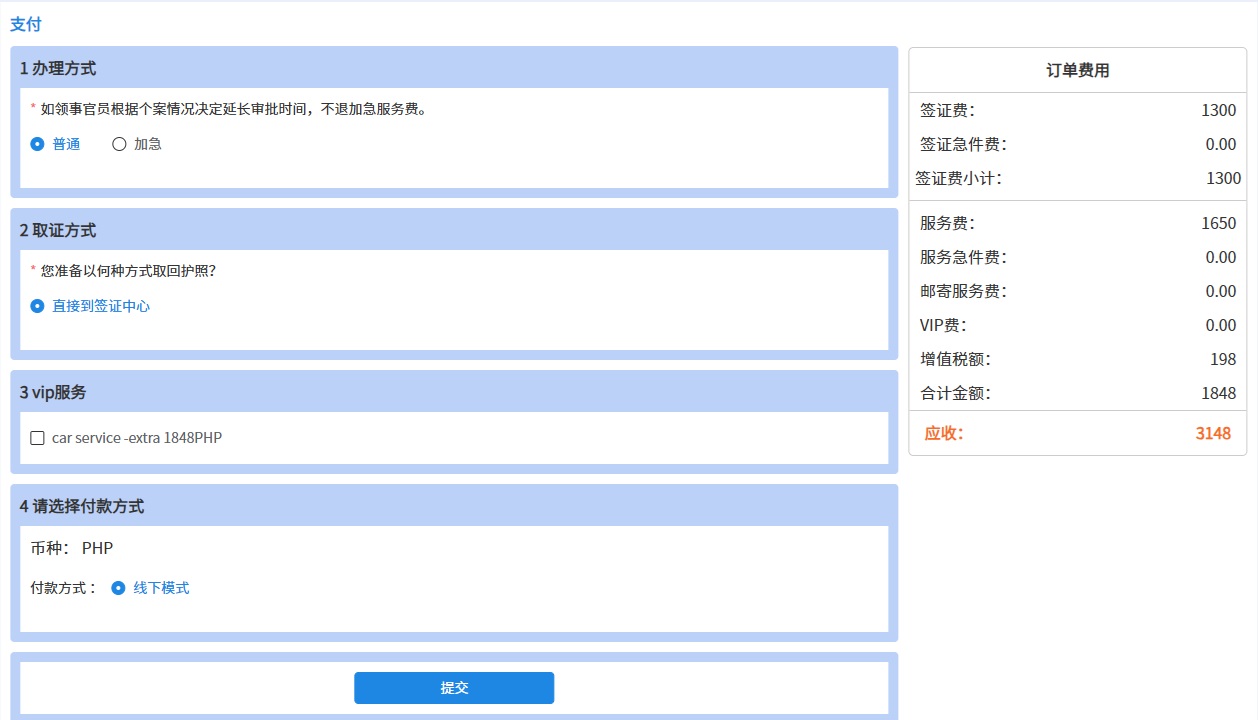 请注意:须在确认费用页面再次点击【提交】按键,否则状态为“待缴费”。由于马尼拉中国签证申请服务中心暂未开通线上支付功能,请在申请通过线上审核后,前往签证中心递交材料时缴费。在线审核阶段默认无加急、特急和VIP服务,如有需要请联系签证中心。