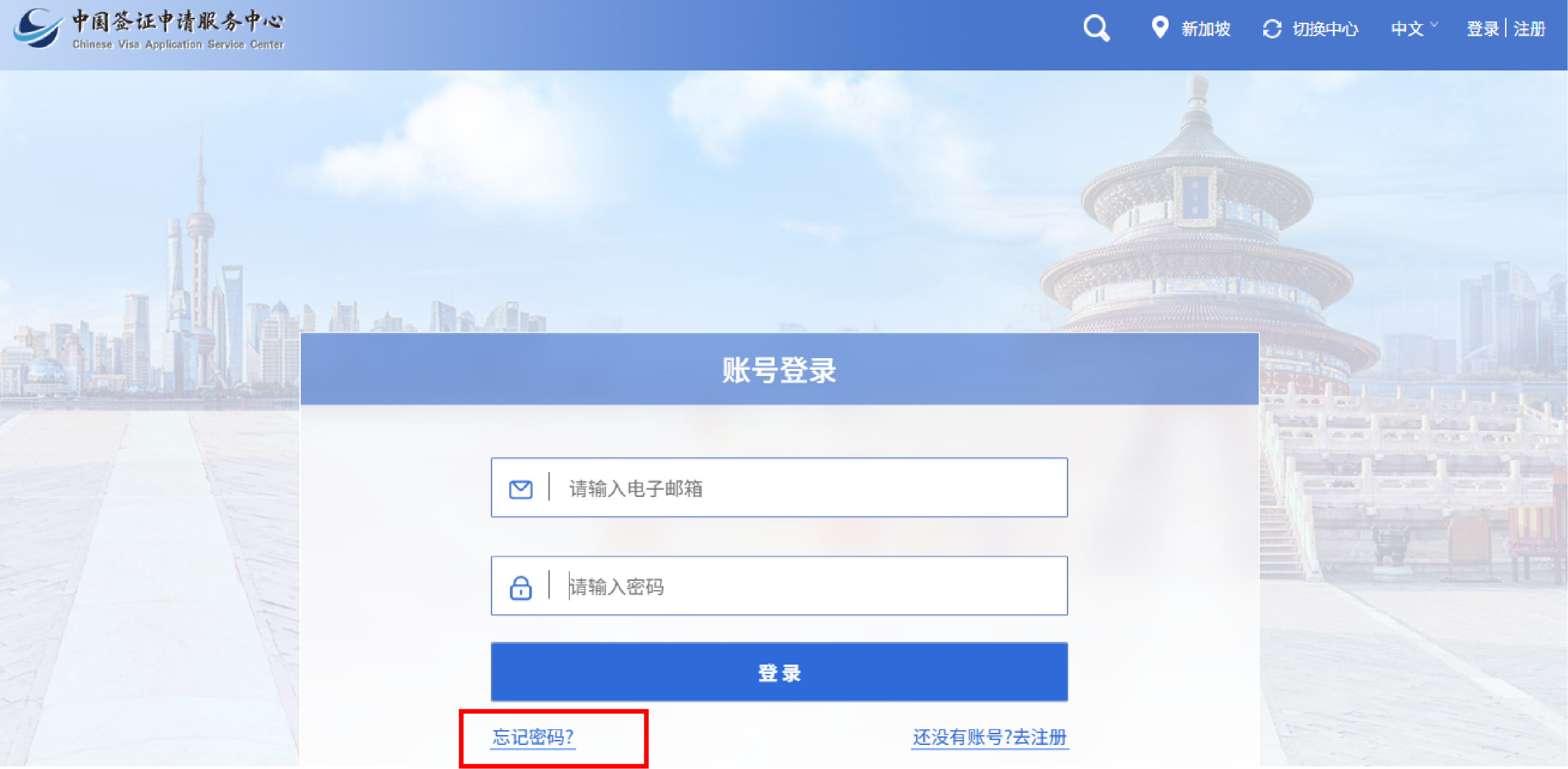 1.输入中心网址www.visaforchina.cn,选择“新加坡”,点击“Take me to the website”。