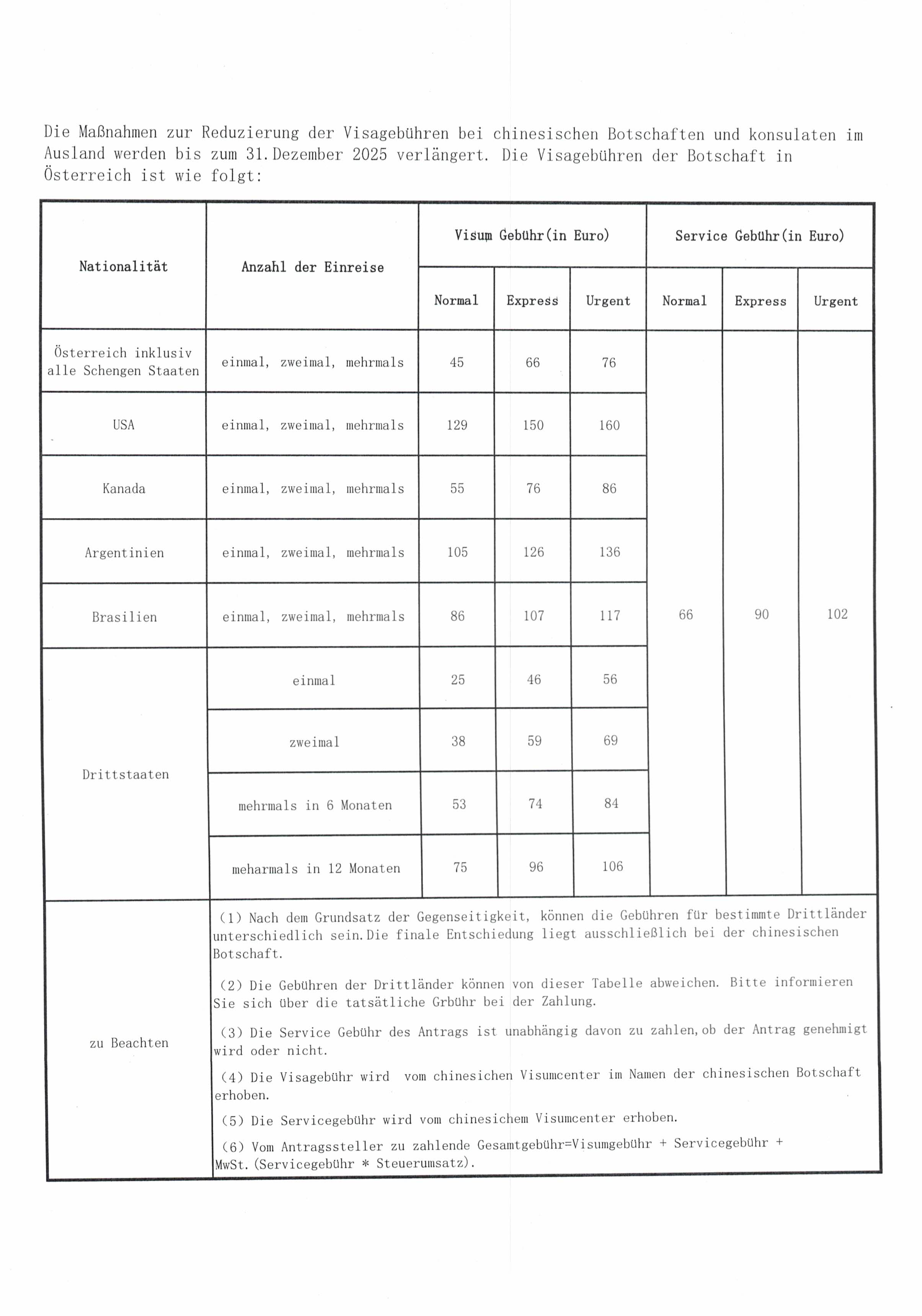 Vorübergehende Gebühren Änderung