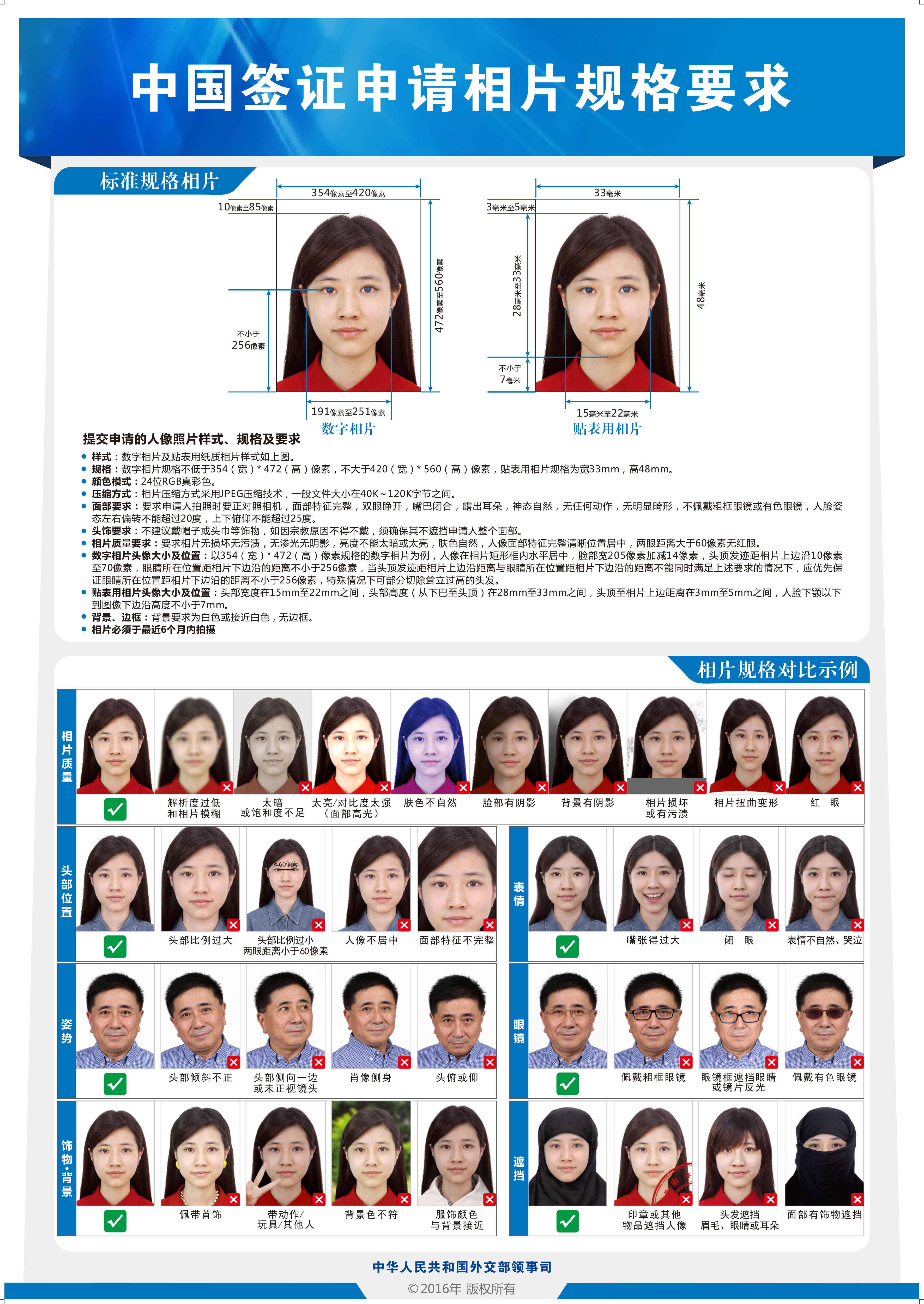 2. 签证申请表及照片:在线填写完整并签名的《中华人民共和国签证申请表》1份,所附照片要求为:近期、正面、彩色(白色背景无阴影)、免冠、小2寸护照照片(48mm×33mm)。 请携带至少一张纸质照片到签证申请中心(须与申请表上传照片一致)。